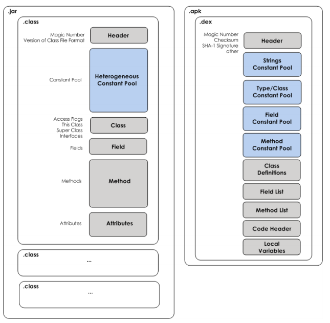 如上图所示,.jar文件里面包含多个.class文件,每个.class文件里面包含了该类的常量池、类信息、属性等等。当JVM加载该.jar文件的时候,会加载里面的所有的.class文件,JVM的这种加载方式很慢,对于内存有限的移动设备并不合适。