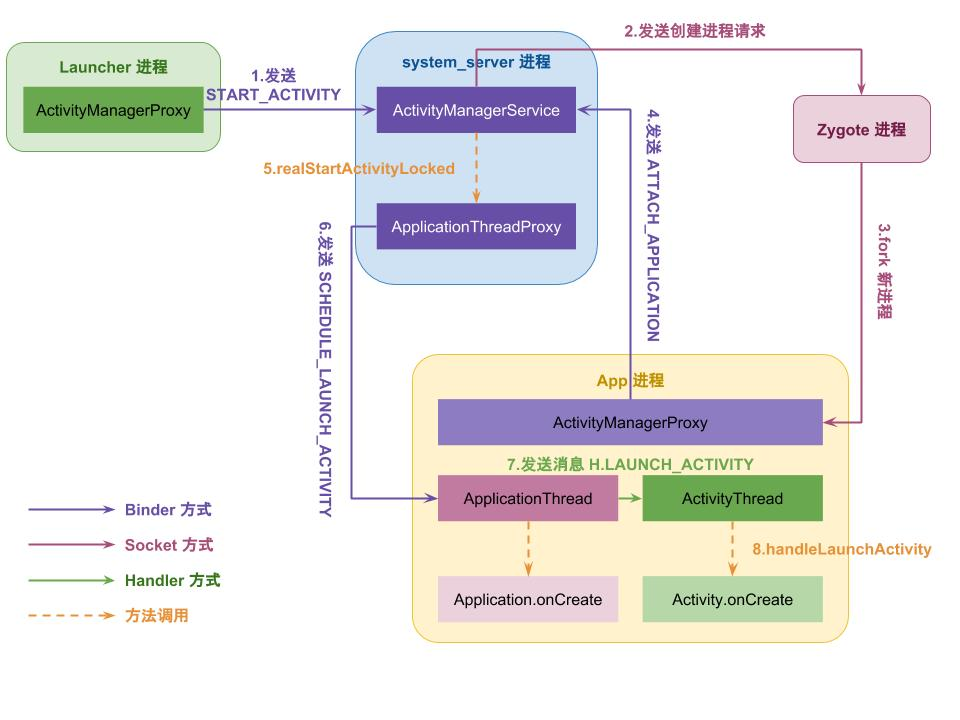 点击 Launcher 时会创建一个新进程来开启 Activity,而应用内打开 Activity,如果 Activity 不指定新进程,将在原来进程打开,是否开启新进程实在 ActivityManagerService 进行控制的,上面分析得到,每次开启新进程时会保存进程信息,默认为 应用包名 + 应用UID,打开 Activity 时会检查请求方的信息来判断是否需要新开进程。Launcher 打开 Activity 默认 ACTIVITY_NEW_TASK,新开一个 Activity 栈来保存 Activity 的信息。