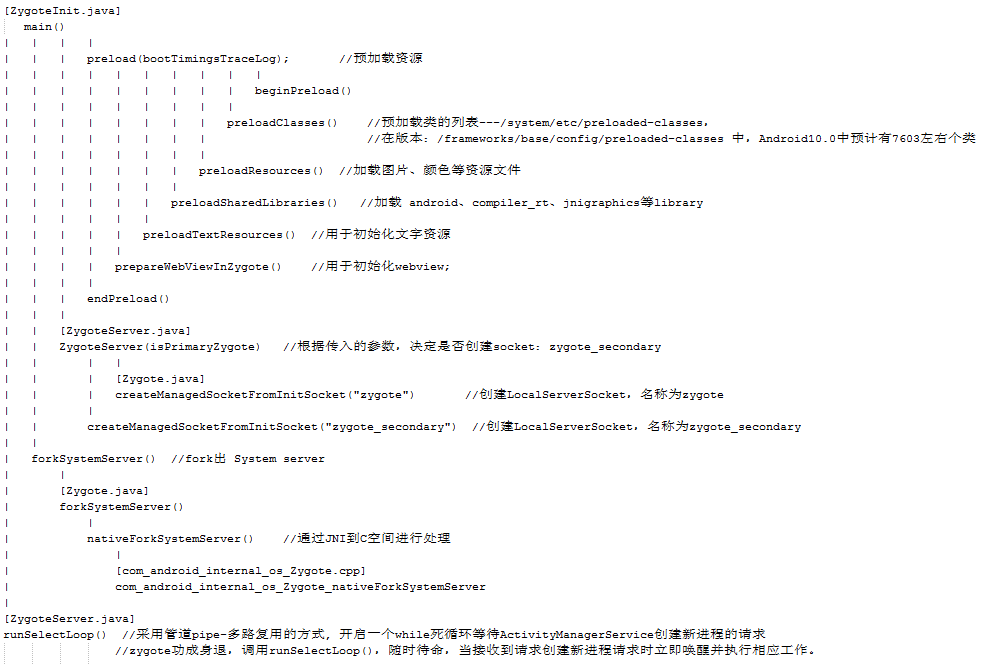 - 通过ZygoteServer创建服务端Socket,预加载类和资源,并通过runSelectLoop函数等待如ActivityManagerService等的请求。