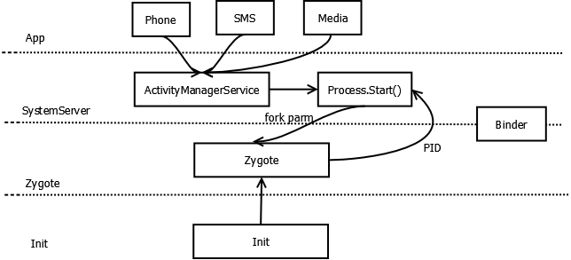 Zygote进程由app_process启动,Zygote是一个C/S模型,Zygote进程作为服务端,其他进程作为客户端向它发出“孵化-fork”请求,而Zygote接收到这个请求后就“孵化-fork”出一个新的进程。