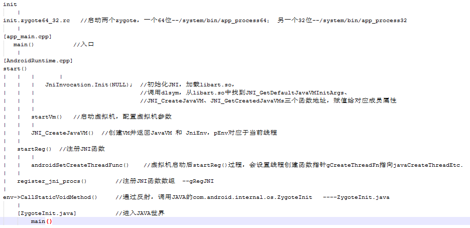 - 通过JNI方式调用ZygoteInit.main(),第一次进入Java世界;