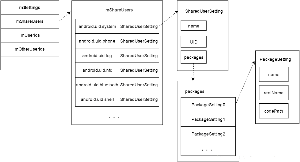 // key是包名,PackageSetting主要包含app的基本信息,如安装位置,lib位置等