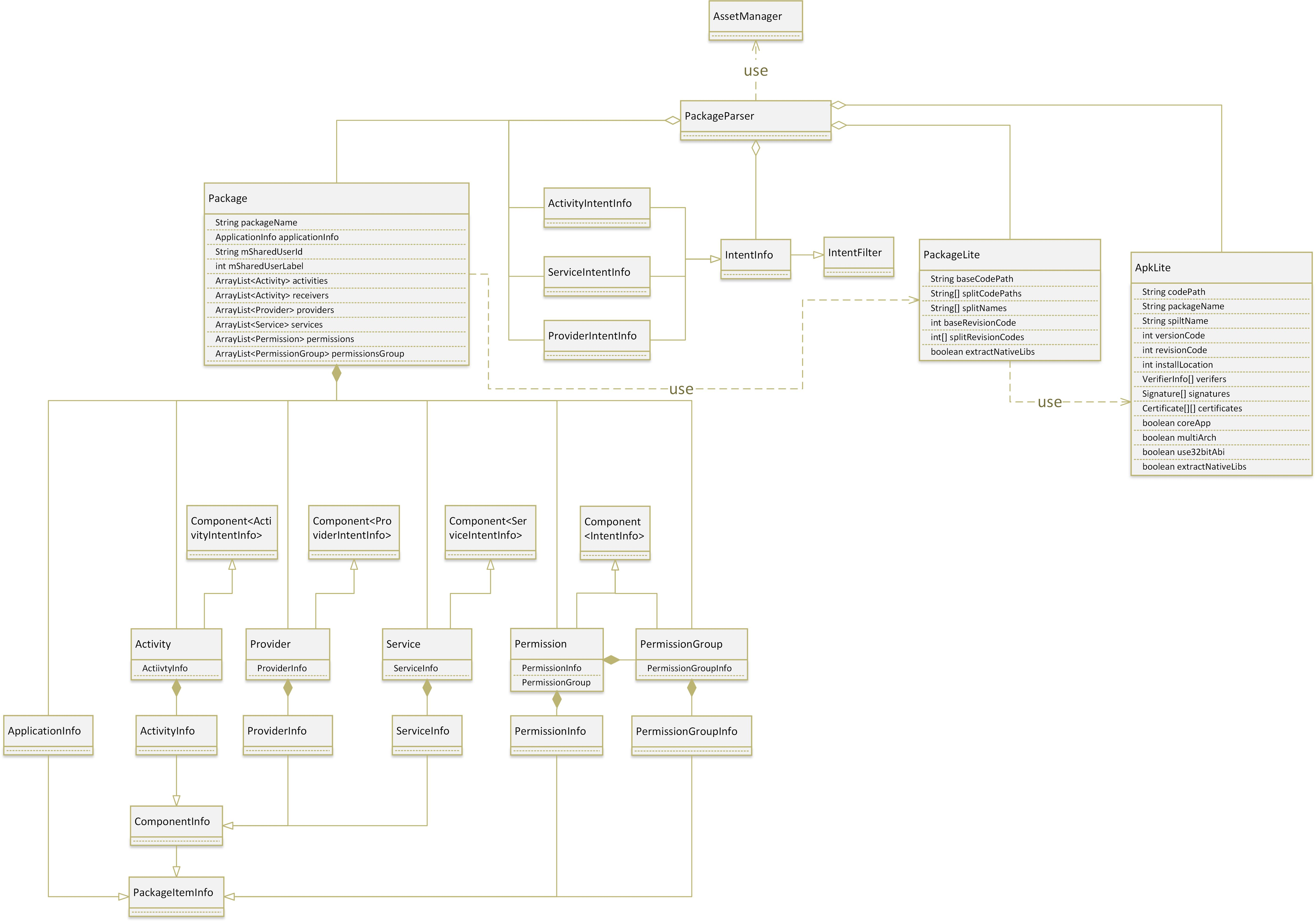 上图画出了PackageParser解析Apk文件,得到的主要的数据结构,实际的内容远多于这些,我们仅保留了四大组件和权限相关的内容。