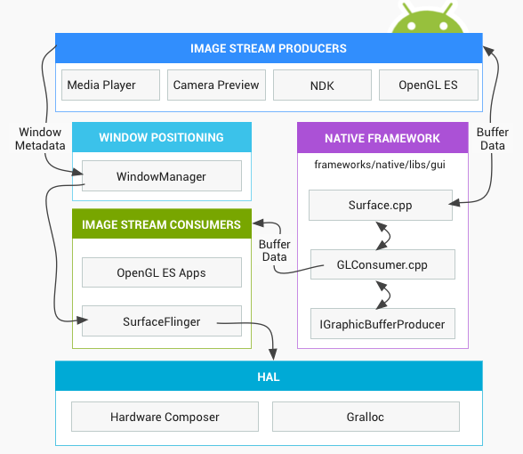 Image Stream Producter(生产者):可产生graphic buffers的生产者,例如:OpenGL ES,Canvas 2D,mediaserver的视频编码器