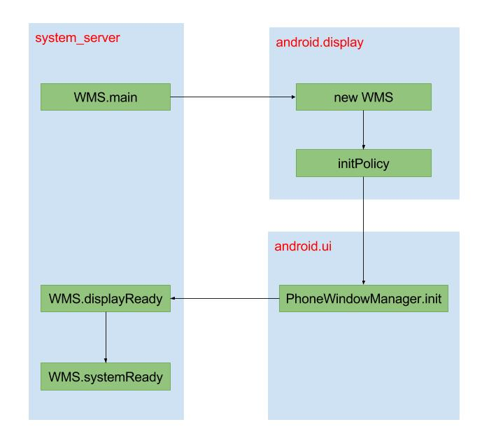 整个启动过程有3个线程,systemserver主线程,”android.display”,”android.ui”,整个过程采用阻塞的方式(利用runWithScissors)执行,WMS.mH的Looper运行在”android.display”进程。流程如下: